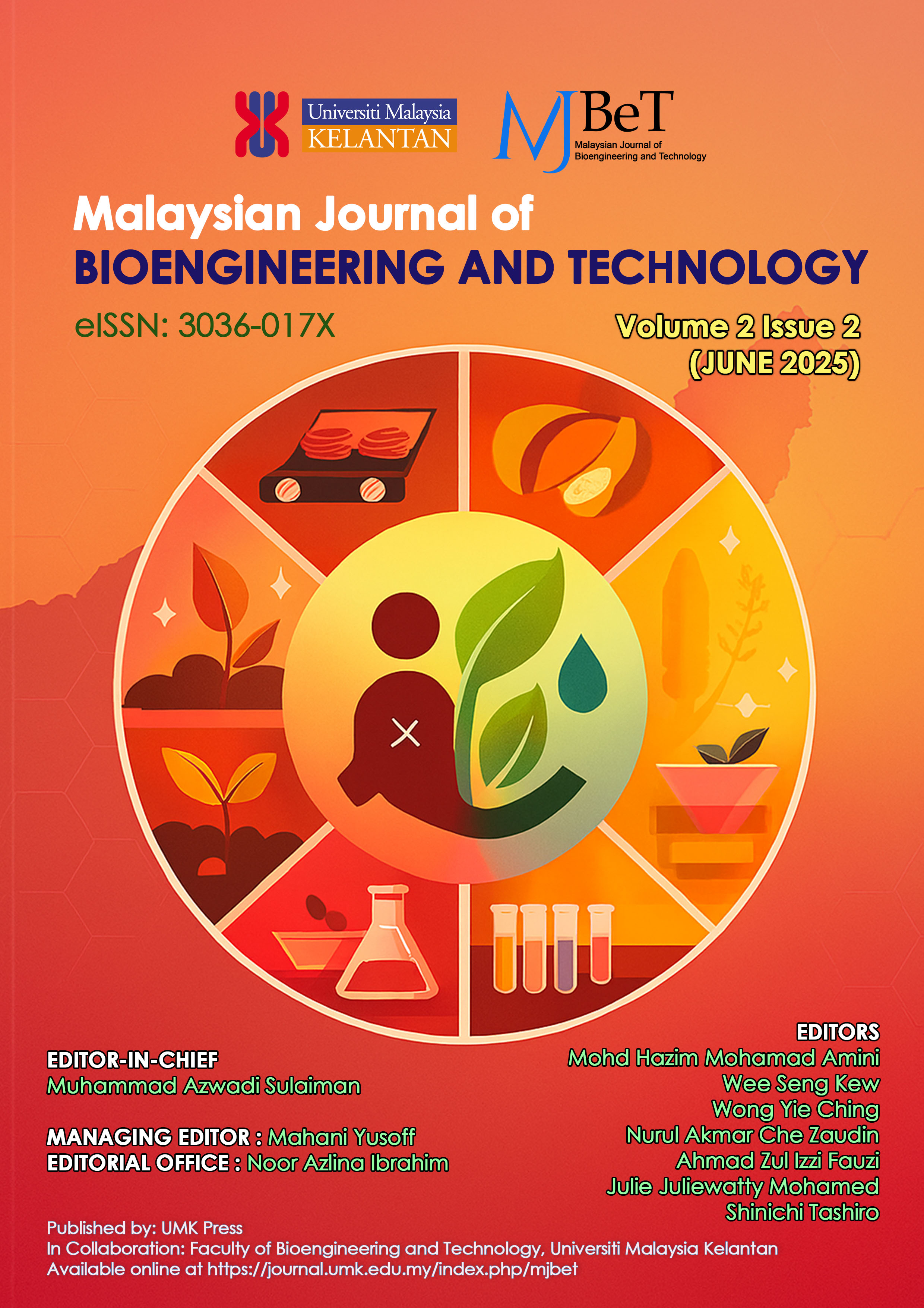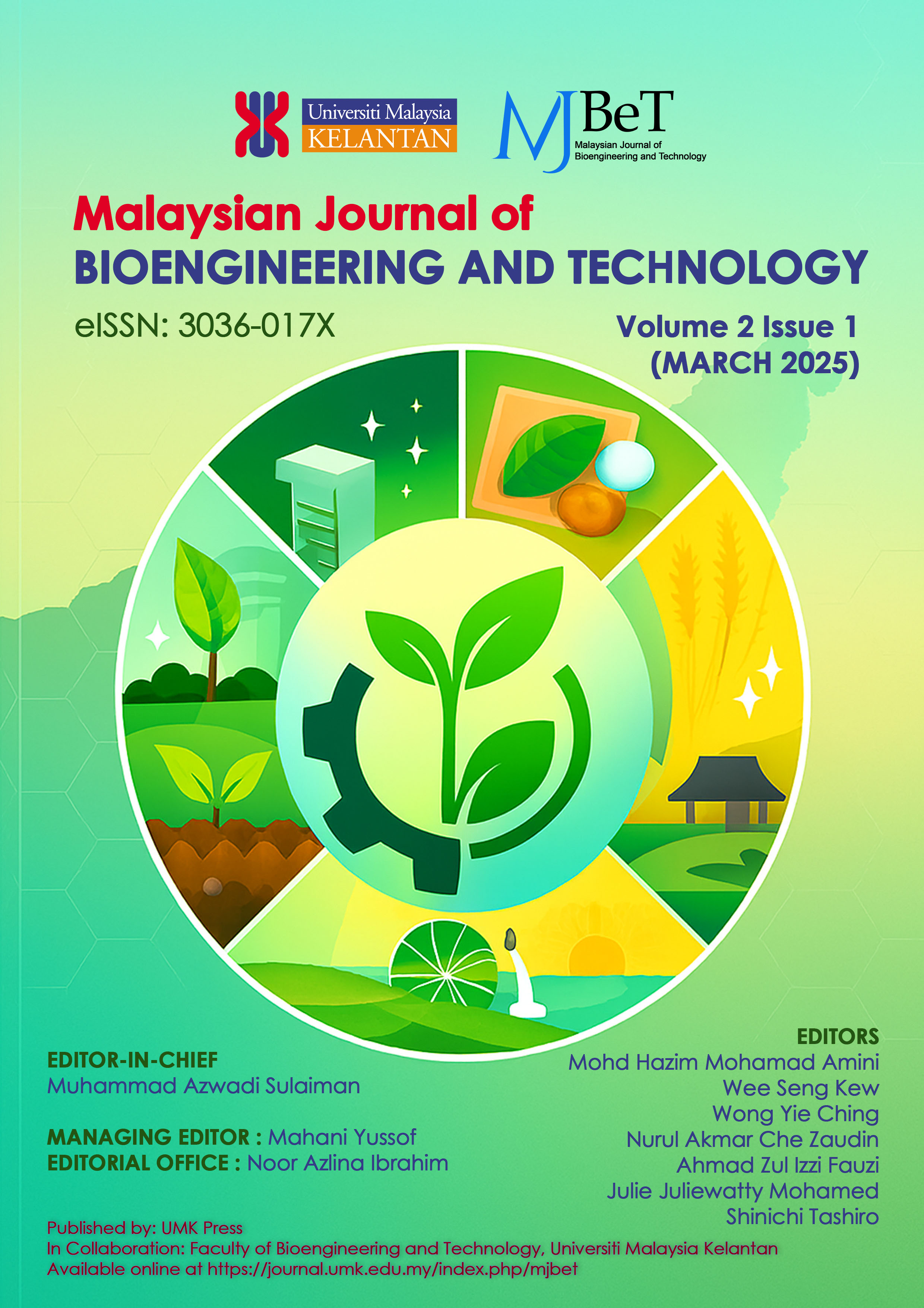 Vol. 1 No. 2 (2024)The December 2024 issue of the Malaysian Journal of Bioengineering and Technology (MJBeT) features research on various topics, including the mechanical and thermal properties of cellulose nanocrystal/graphene nanoplatelet biocomposites, performance of polymer inclusion membranes for gold extraction, advancements in wire arc additive manufacturing, antibacterial studies on graphene oxide alginate, biohydrogen production techniques, and enzymatic pretreatment of lignocellulosic biomass for bioenergy conversion. The issue also covers the effects of silver complexes on antibacterial properties and the synthesis of CaCu3Ti4O12 using microwave processing techniques.